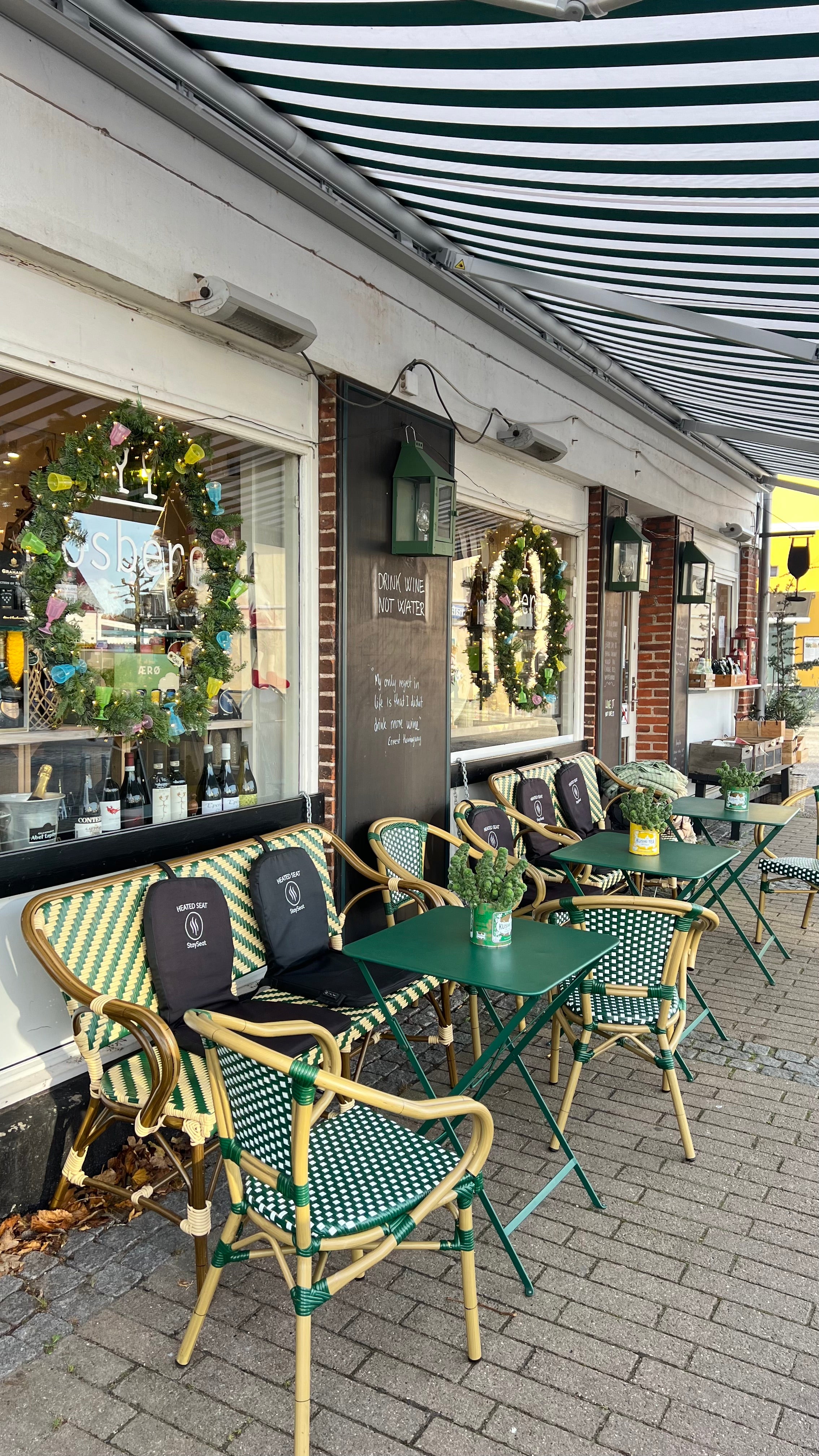Vi servere hvad mange mener er byens bedste kaffe og har altid et opdateret vinkort med udvalgte vine på glas, alle ugens dage. Om vinteren er der varmelamper og varmepuder og om sommeren får du byens bedste udsigt til liv, glade dage og vand.