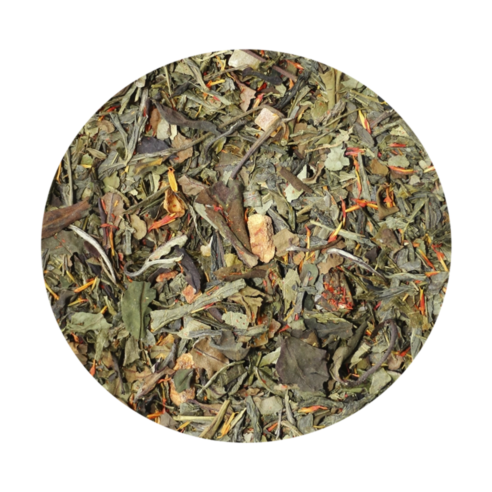 Ingredienser: Grøn Sencha te(52%), Grøn Hvid Te Granatæble granatæble stykker(9%), hvid Pai Mu Tan te(19%), kandiserede papayastykker (9%) (tørret papaya, rørsukker, konsistensmiddel: E509, surhedsregulerende middel: E330), saflorblomster(4%), birkeblade (2%) og aroma.
