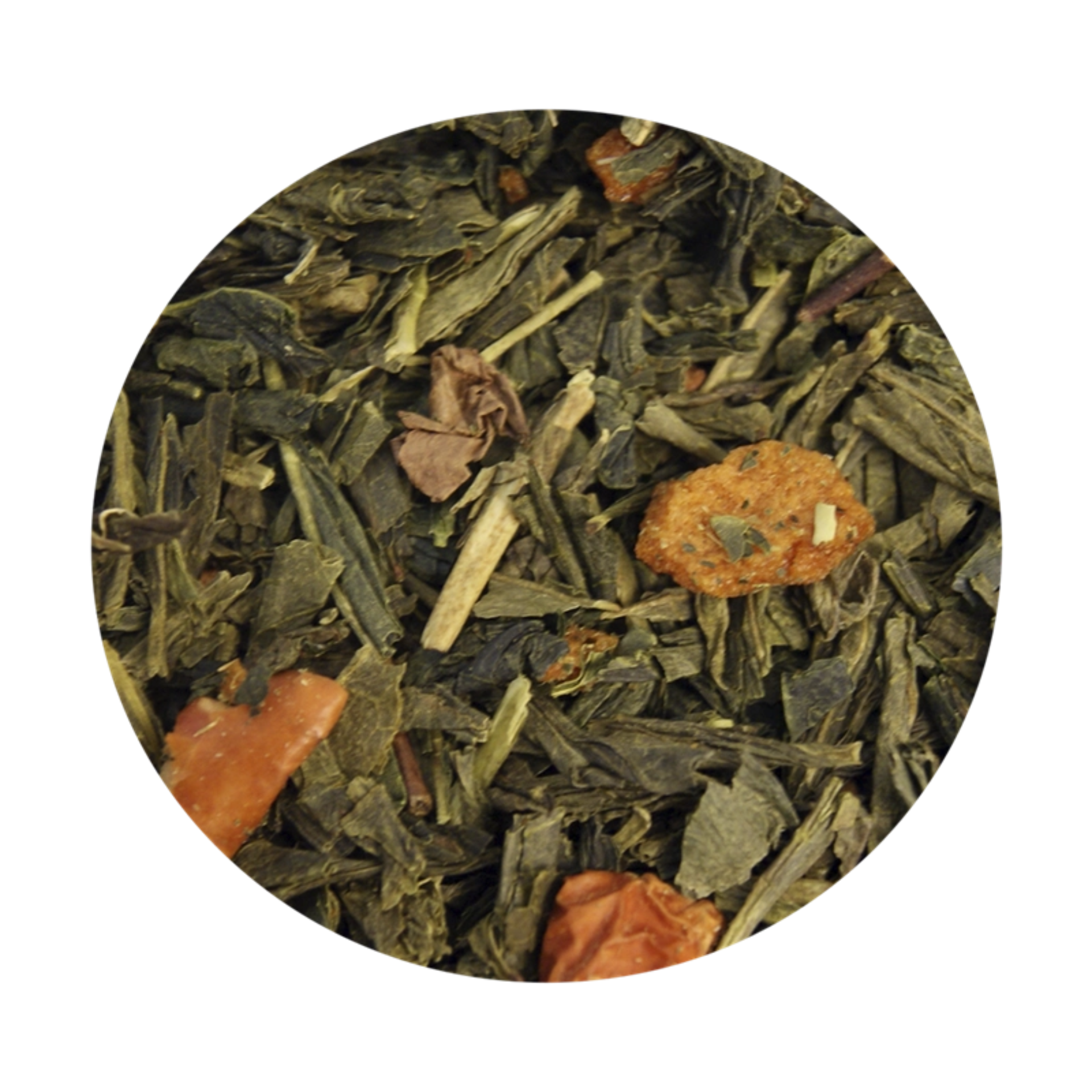 Ingredienser: Grøn Sencha te (84%), tørrede æblestykker (10%), frysetørrede kvædestykker (3%) og aroma.