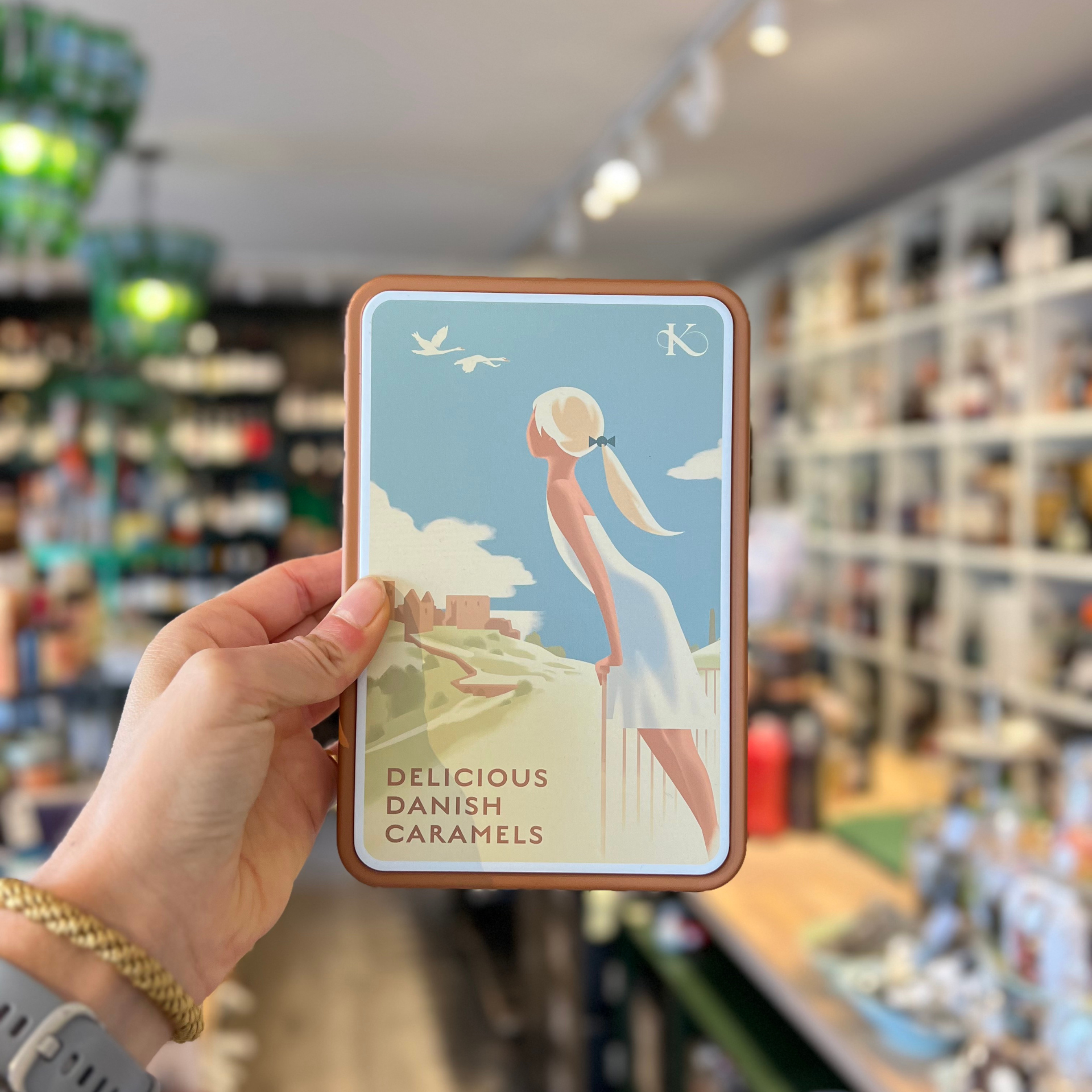 Den dygtige og talentfulde kunster Mads Berg har tegnet det smukke motiv, Hammershuspigen, eksklusivt for Karamel Kompagniet. Illustrationen, er trykt direkte på dåsen, der indeholder 236g Gudhjem – Klassisk blanding, med Klassisk Fløde, Klassisk Lakrids og Klassisk Chokolade.