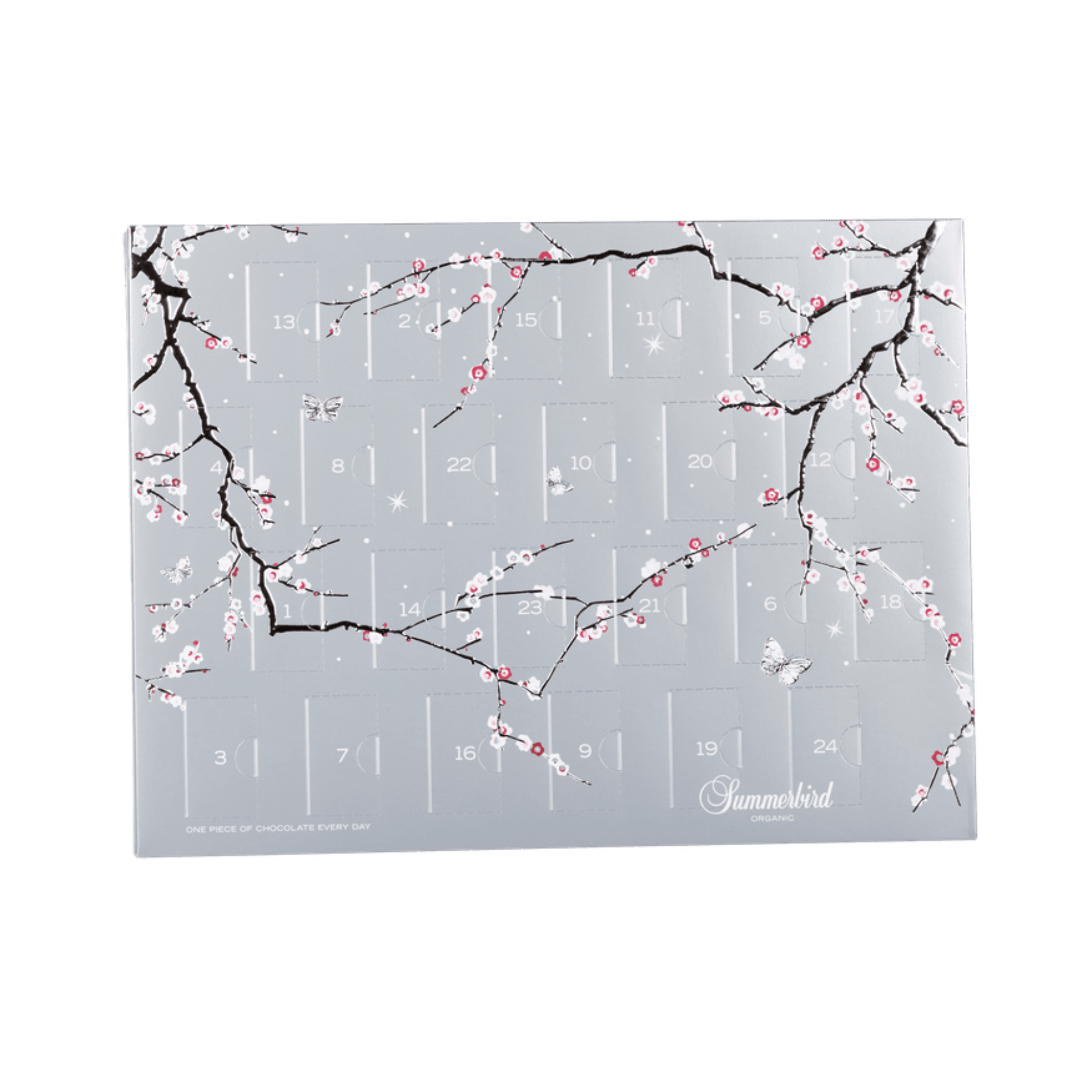 Årets klassiske julekalender med sølvmotiv er inspireret af det ikoniske tapet, som dekorerer alle vores Summerbird-Chocolaterier. Julekalenderen indeholder både vores smagfulde chokoladebarer og elegante, fyldte chokolader. Julekalenderen indeholder 12 forskellige varianter. Bag hver låge gemmer sig 1 stykke chokolade.