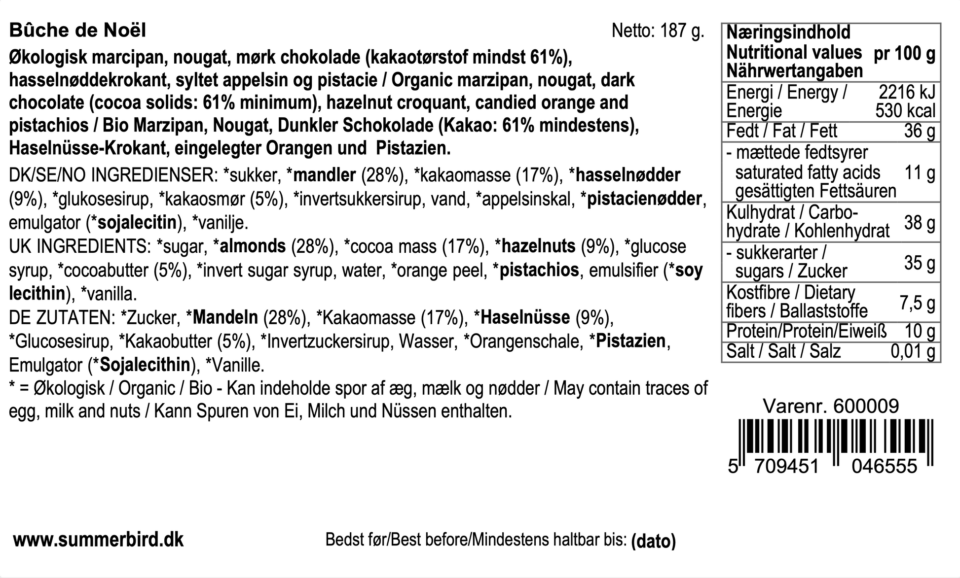 Raffineret og klassisk julebrød på marcipan af stenvalsede middelhavsmandler og nougat. Overtrukket med vores mørke chokolade Arriba Nacional. Afslutningsvist dekoreres julebrødet med knust krokant af Piemonte-hasselnødder, kandiseret skal af solmodne spanske appelsiner og pistacie. Et julebrød i særklasse hvor håndværk, råvaren og enkeltheden er i centrum.