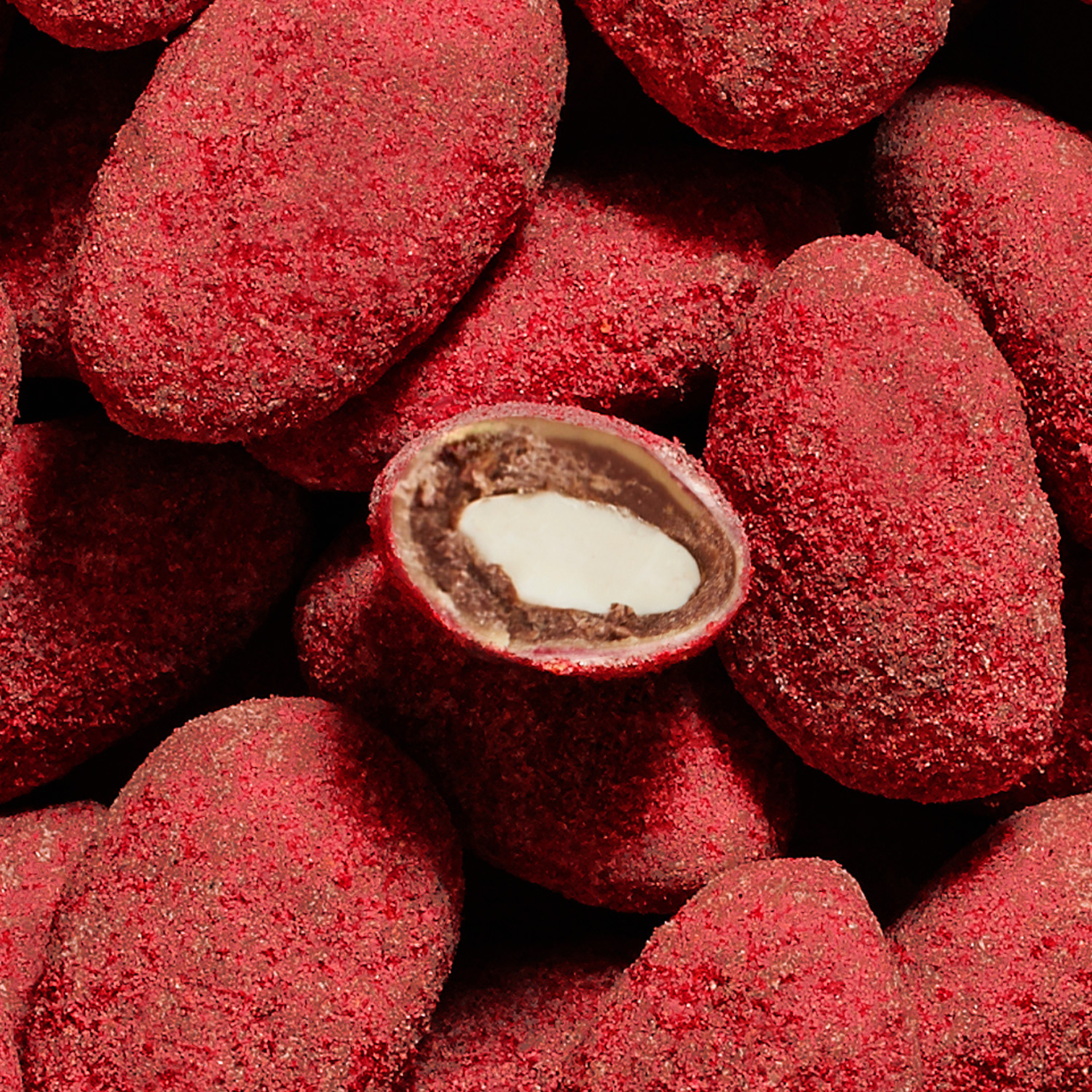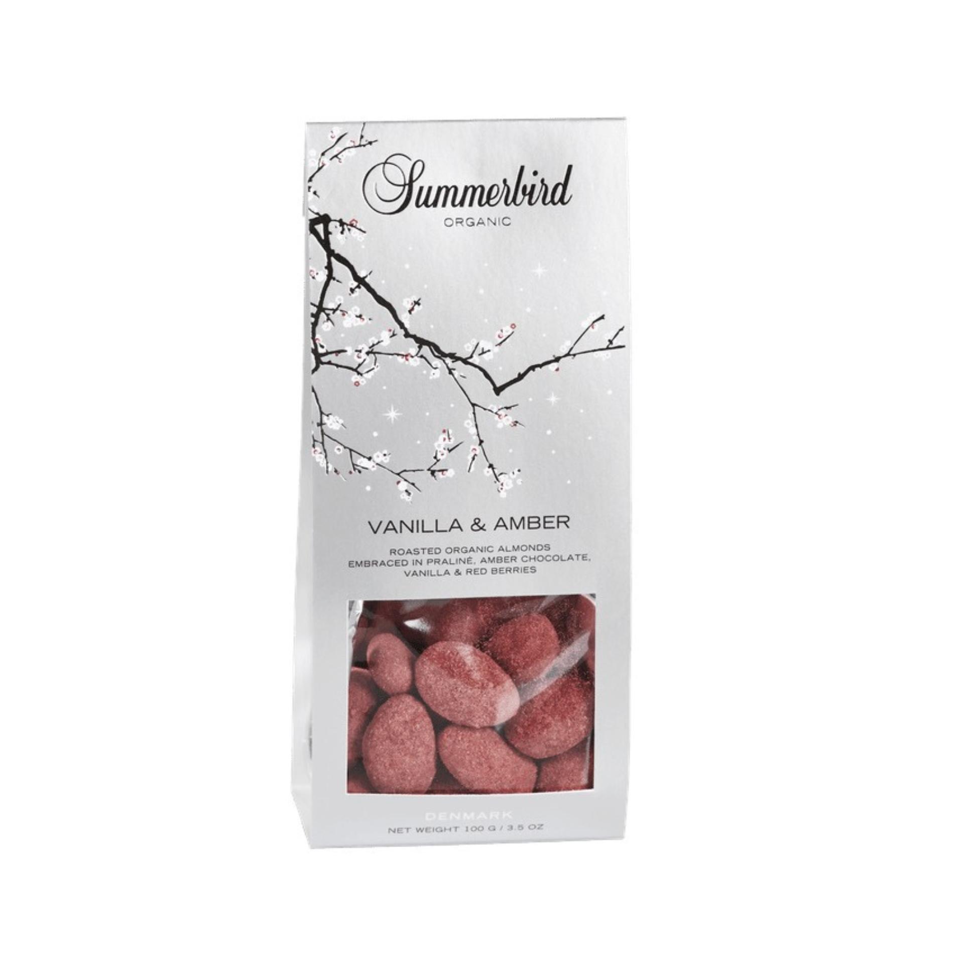 Let ristede spanske mandler drageret i praliné og krokant. Overtrukket med et tykt lag af vores prisvindende Amber Classic-chokolade og afslutningsvis vendt i det fineste pulver af røde bær og rigelige mængder vanilje. Harmoniske og unikke mandler med konsistens og frugtighed.