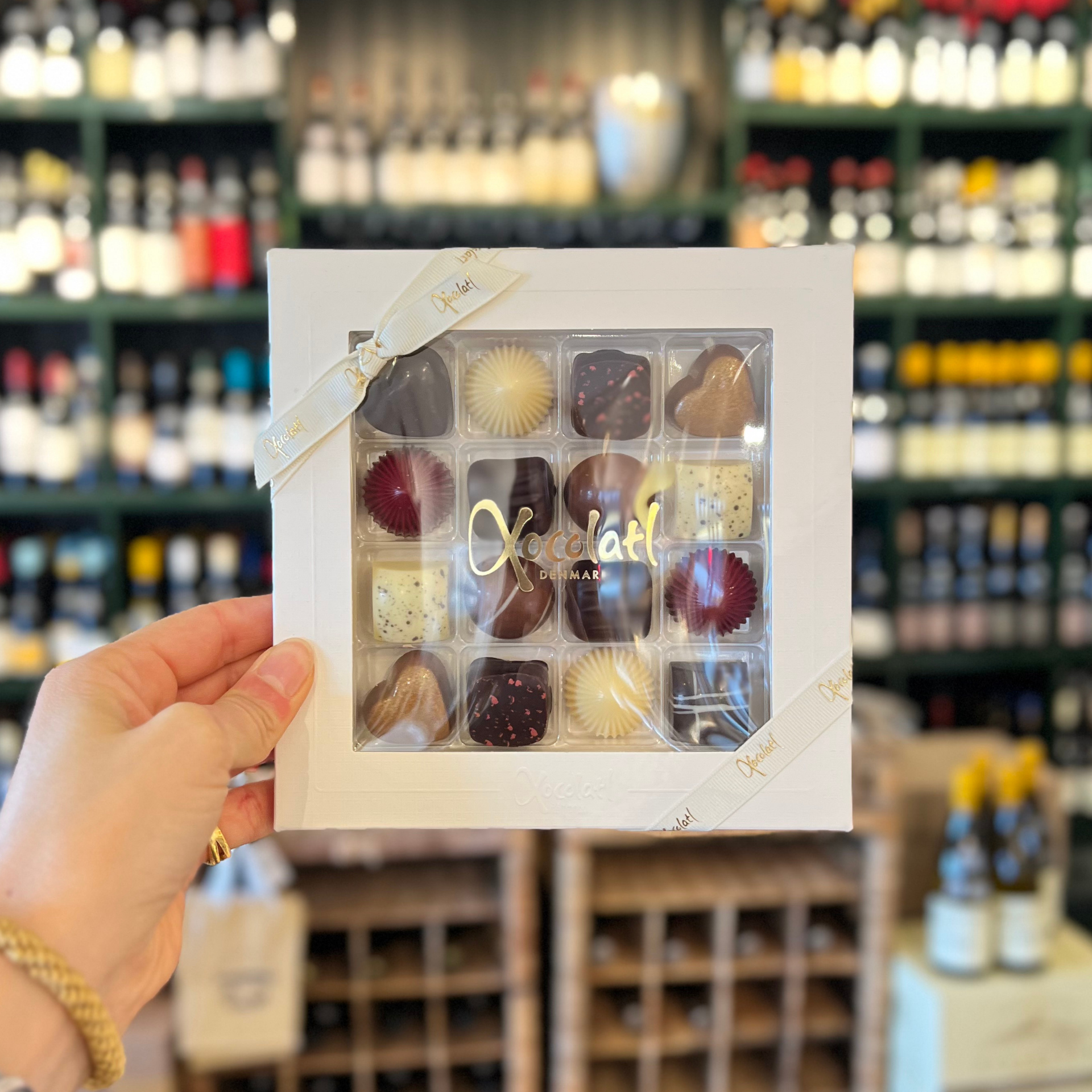 Gaveæske med 16 fyldte chokolader fra Xocolatl. Med 16 stykker får du en alsidig smagsrejse, som kan deles med familie, venner eller nydes alene i ro og mag.